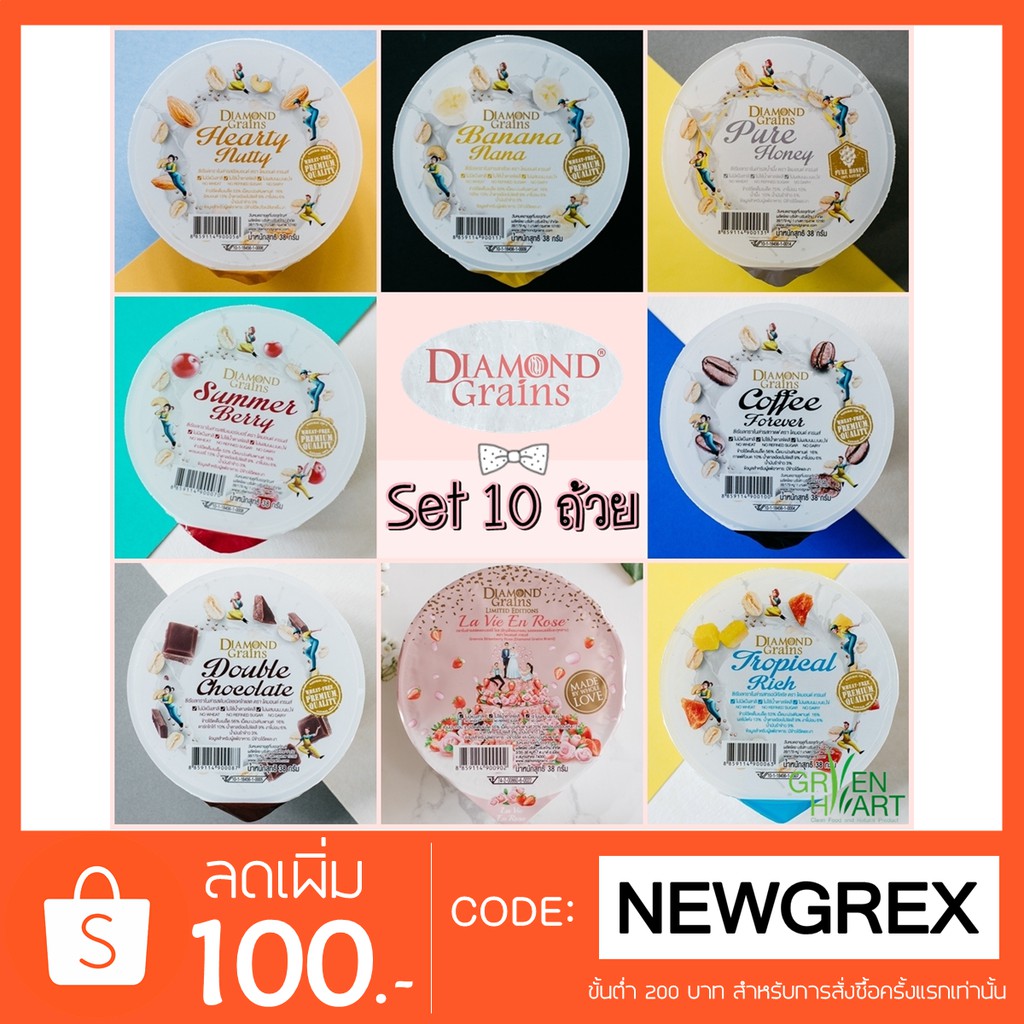 เซ็ต 10 ถ้วย ---> รบกวนลูกค้าแจ้งรสชาติ ที่ข้อความถึงผู้ขายตอนสั่งซื้อนะคะ กรุณาใส่ที่อยู่ และ เบอร์โทรศัพท์ ที่ถูกต้องและชัดเจน Kerry จะโทรหาลูกค้าก่อนนำสินค้าไปส่งนะคะ Diamond Grains กราโนล่าคลีนเจ้าแรกในไทย เจ้าของสูตรความอร่อยแบบ ไม่ใช้แป้งสาลี ไม่มีน้ำตาลขัดสี เต็มไปด้วยคุณค่าทางอาหารจากธัญพืชหลากชนิด มีรสชาติให้เลือกมากมาย อร่อย สุขภาพดีง่ายๆ แค่เปิดฝา ขับถ่ายง่าย: ปรับสมดุลระบบย่อยและขับถ่าย เพราะมีไฟเบอร์สูง สบายท้องทุกวัน อร่อย: รสชาติดี กรุบกรอบ ทานง่าย ใช้ทำได้หลายเมนูไม่ว่าจะทานเปล่าๆ ทานคู่นม โยเกิร์ต สลัดและอื่นๆ มีทั้งหมด 12 รสชาติ Hearty Nutty ธัญพืชอบกรอบพร้อมอัลมอนด์และถั่ว Tropical Rich ธัญพืชอบกรอบและผลไม้ tropical Double Chocolate ธัญพืชอบกรอบดาร์คช็อคโกแลต Summer Berry ธัญพืชอบกรอบและแครนเบอรี่ Coffee Forever ธัญพืชอบกรอบกับกาแฟ Banana Nana ธัญพืชอบกรอบและกล้วย Pure Honey ธัญพืชอบกรอบรสจืด ไม่มีถั่ว ใช้น้ำผึ้งแทนน้ำตาล Mocha Moment ธัญพืชอบกรอบรสมอคค่า Strawberry Rose ธัญพืชอบกรอบรสสตรอว์เบอร์รีและกุหลาบ OVERNIGHT Original ธัญพืชอบสำหรับแช่นม รสออริจินัล OVERNIGHT Chocolate ธัญพืชอบสำหรับแช่นม รสชอคโกแลต OVERNIGHT Honey ธัญพืชอบสำหรับแช่นม รสจืด-น้ำผึ้ง DiamondGrains แบบถ้วย ไฟเบอร์สูง ลดน้ำหนัก HeartyNutty DoubleChocolate MatchaGreentea Banana Coffee Mocha Purehoney StrawberryRose Summerberry TropicalRich กราโนล่า